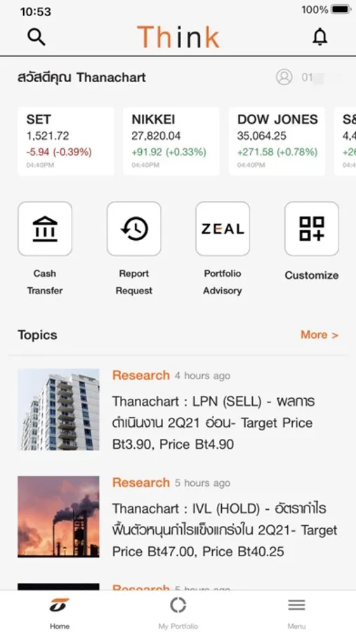 “Thanachart Think” is a new investment application from Thanachart Securities. “Thanachart Think” offers relevant news, stock and mutual fund recommendations, asset allocation, wealth research, derivatives research, quant and technical recommendations. "Thanachart Think" also provides consolidated statements of clients' investments across asset classes. Thanachart Securities creates “Think” with core intention of delivering investors high quality information, analysis and tools for the best investment decision making for all asset management within a single application.