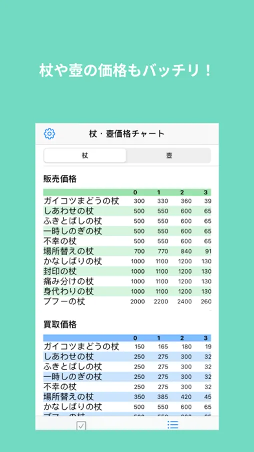 ・杖・壺のお店での販売価格や買取価格からアイテムを識別できる「杖・壺価格チャート」