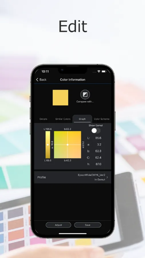 - You can manage the colors imported to your app as reference colors, inspect them by comparing with a Color Collection, and check if the colors can be reproduced by the printer you are using.