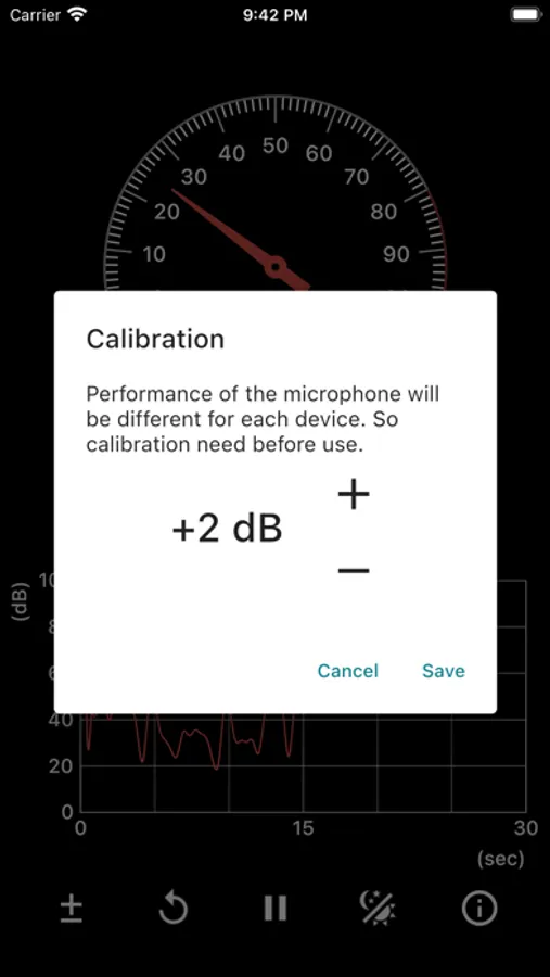 Microphones in most devices are aligned to human voice and the maximum values are limited by the hardware. Very loud sounds (~90 dB and more) may not be recognized. So please use it as just an auxiliary tools. If you need more accurate dB values, we recommend a actual sound level meter for that.