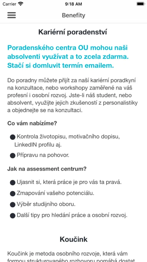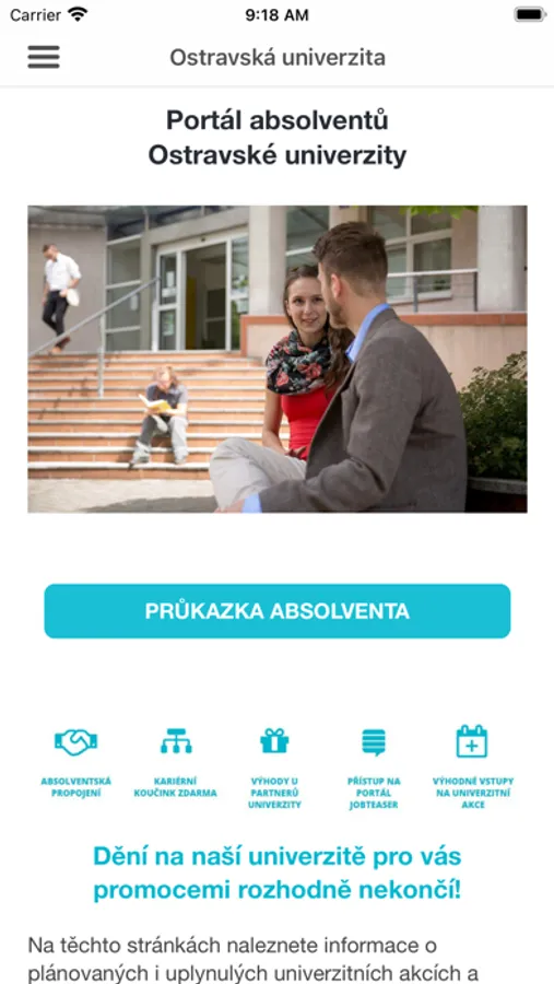 Aplikace Absolvent OU poskytuje důležité informace o  absolventech Ostravské Univerzity. V aplikaci lze najít informace o Ostravské Univerzitě, aktualitách, benefitech, kontaktech, ale především je v aplikaci Průkaz absolventa.