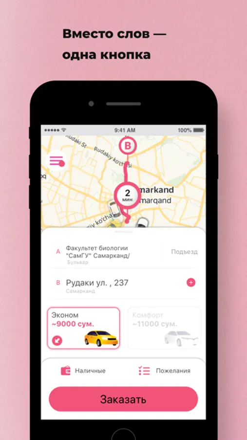 Откройте приложение, укажите адрес и закажите такси, нажав на одну кнопку.