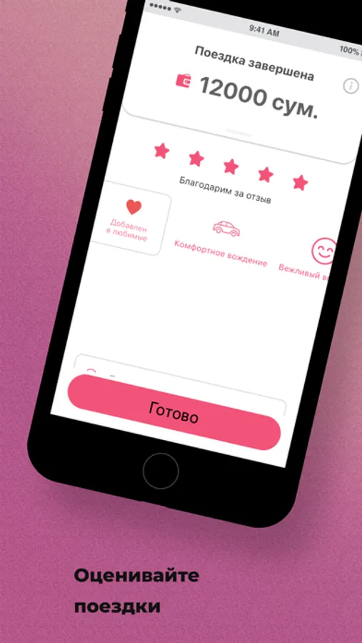 Оценивайте поездку с помощью готовых шаблонов. Занесите водителя в “Избранные”, если понравилась поездка, или поблагодарите его чаевыми.