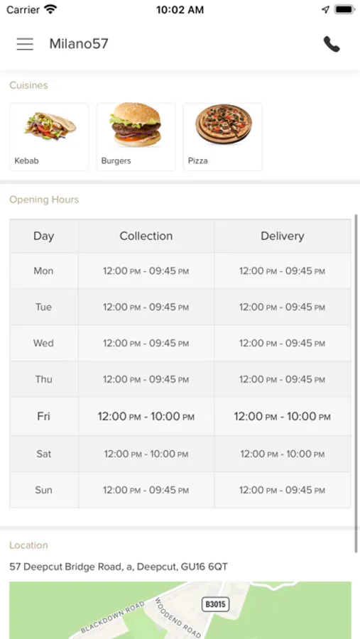 Order food online in Deepcut! It's so easy to use, fast and convenient. Try our new, online app which contains our entire takeaway menu. The Milano 57 is located in Deepcut.