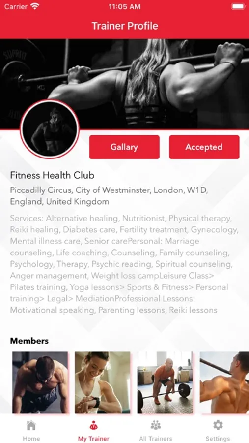 All Trainers: Trainees can see all the trainer profiles registered in the app. Trainees can see each Trainer profile data and can send requests to become a member of that trainer.