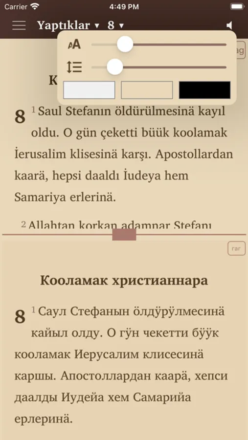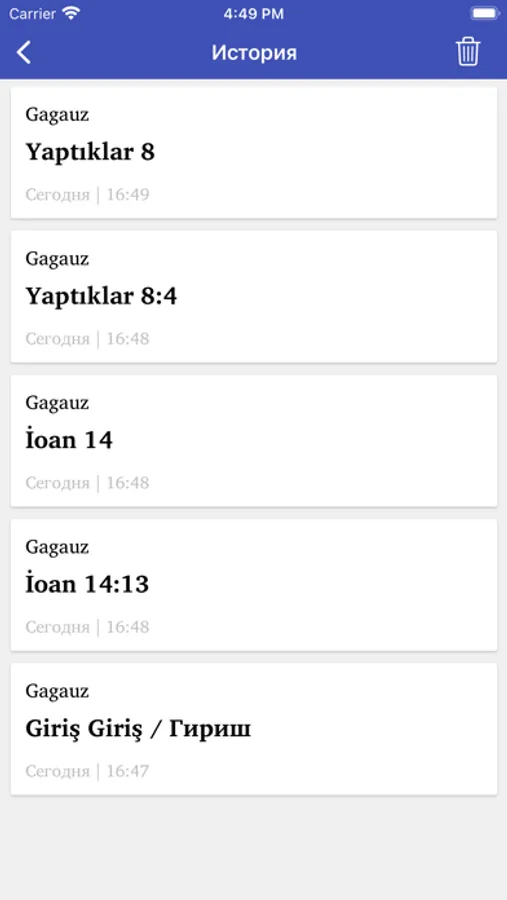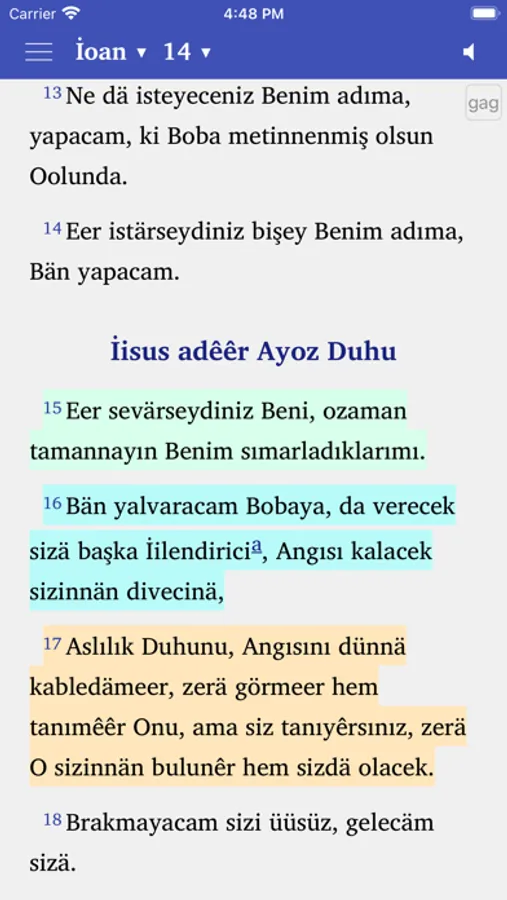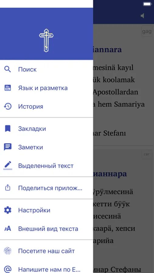 This New Testament app facilitates Bible study in the Gagauz language. Two Gagauz scripts are used in this app, Roman and Cyrillic. The Russian Synodal translation can optionally be added in parallel to one of the Gagauz texts, or all three texts can be viewed in verse by verse mode. Users can highlight verses in different colors, make bookmarks, write notes and view their reading history.