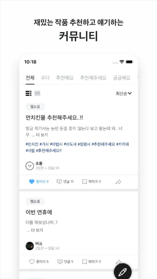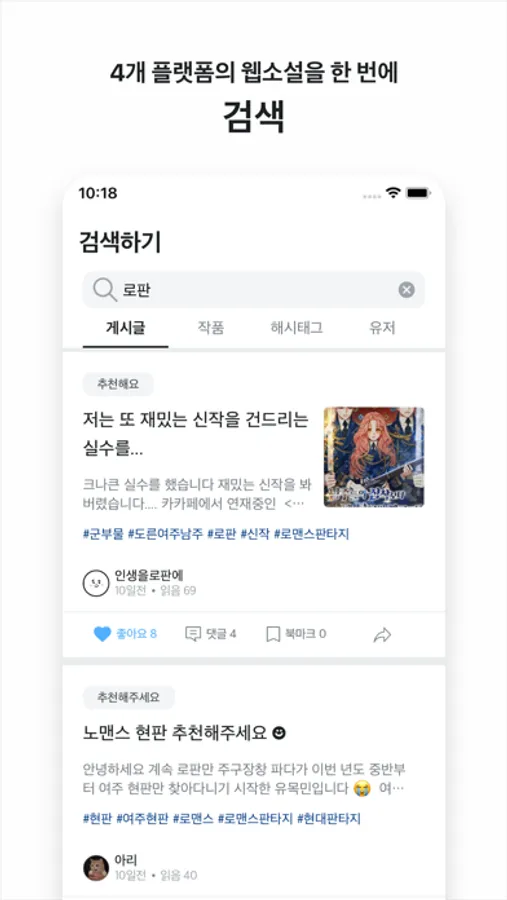 게시글, 작품, 해시태그, 유저 검색을 통해서 더 자세하게 찾아봐요. 다양한 게시글과 웹소설 작품들을 쉽게 찾을 수 있어요.