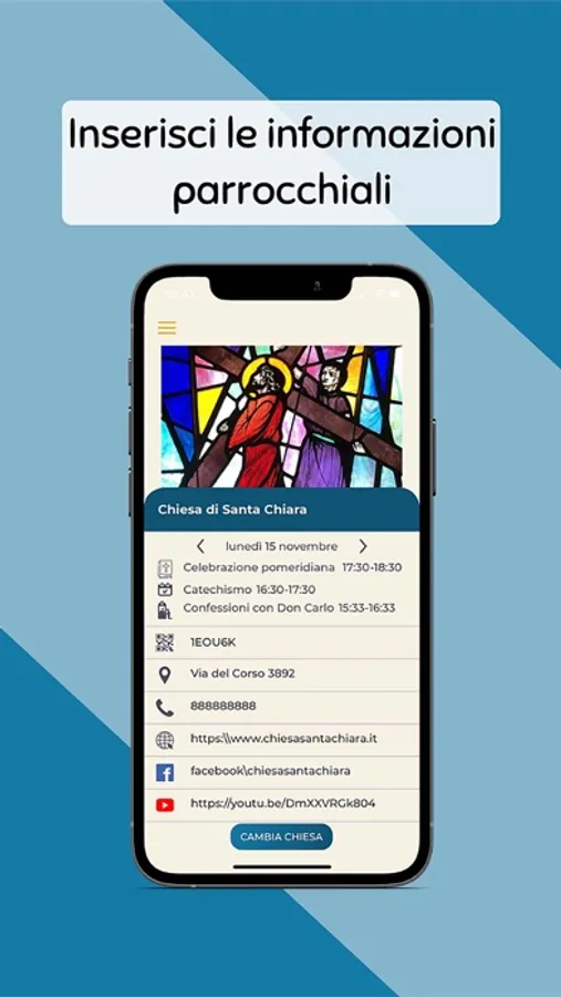 Nella sezione “Chiesa” puoi inserire tutte le informazioni relative alla parrocchia e personalizzare l’app con l’immagine parrocchiale. Inoltre, puoi definire nel calendario tutti gli appuntamenti giornalieri, settimanali o mensili. In questo modo, i fedeli sapranno sempre gli orari degli appuntamenti parrocchiali e i contatti utili.