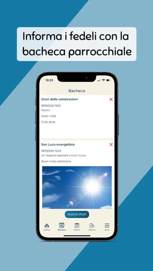 Nella sezione “Bacheca” puoi creare post informativi, con testi, immagini e link, e inviarli direttamente alla bacheca virtuale disponibile sull’app dei fedeli. I fedeli saranno informati in tempo reale delle iniziative parrocchiali e potranno interagire mettendo “mi piace” al post in bacheca.