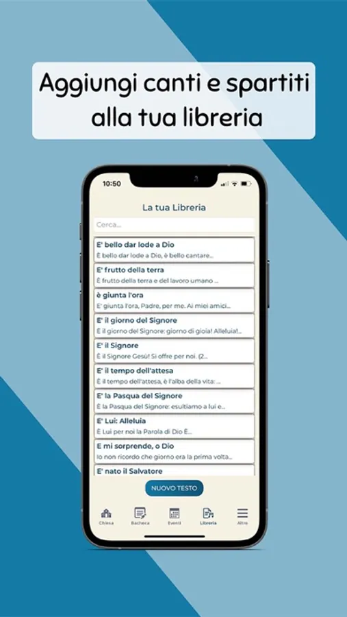 Nella sezione “Libreria” puoi inserire qualsiasi tipo di testo e caricare gli spartiti di ogni canto.