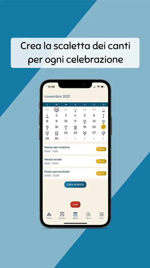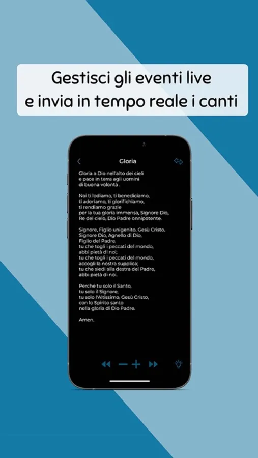 Una volta avviato un evento, lo si potrà gestire nella sezione “Live” inviando testi al fedele nel momento giusto. Così facendo non dovranno più distrarsi a cercare il canto o la preghiera durante il momento di preghiera.