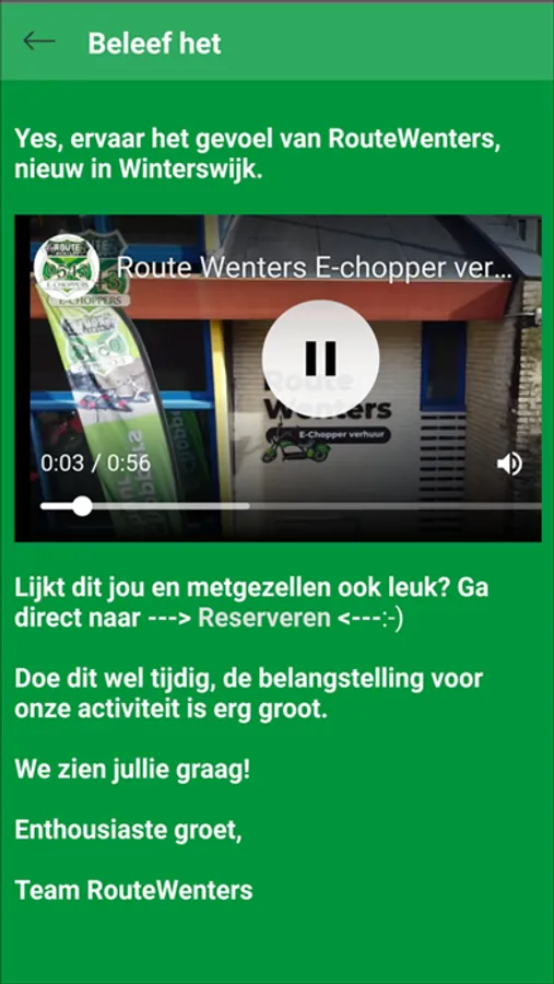 Met de Route Wenters App heeft u alles bij de hand voor uw avontuur onderweg. Rij van van hotspot naar hotspot, profiteer onderweg van leuke deals of reserveer deze voorafgaand aan uw vertrek. Beleef en geniet van het mooie Winterswijk en omstreken, zonder te verdwalen!
