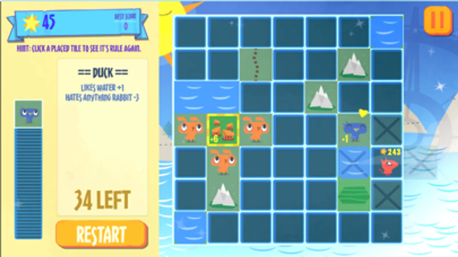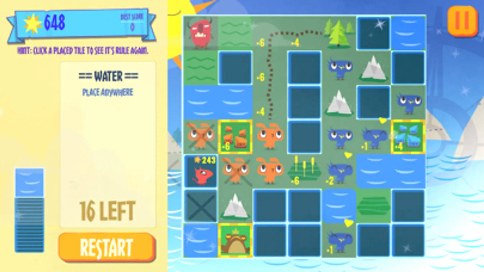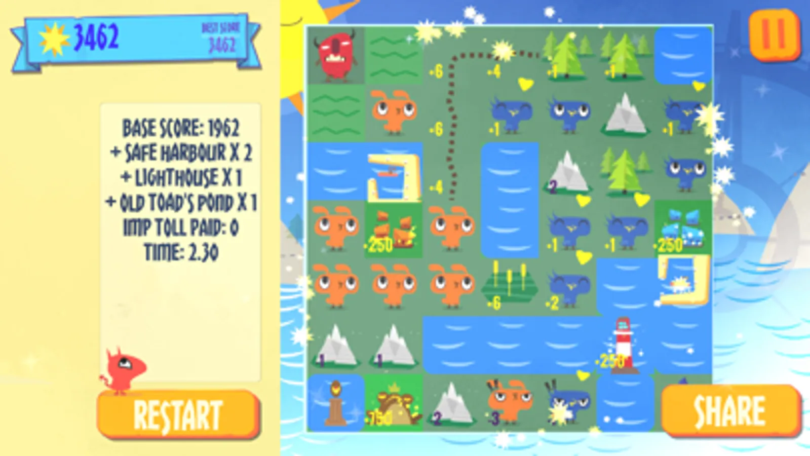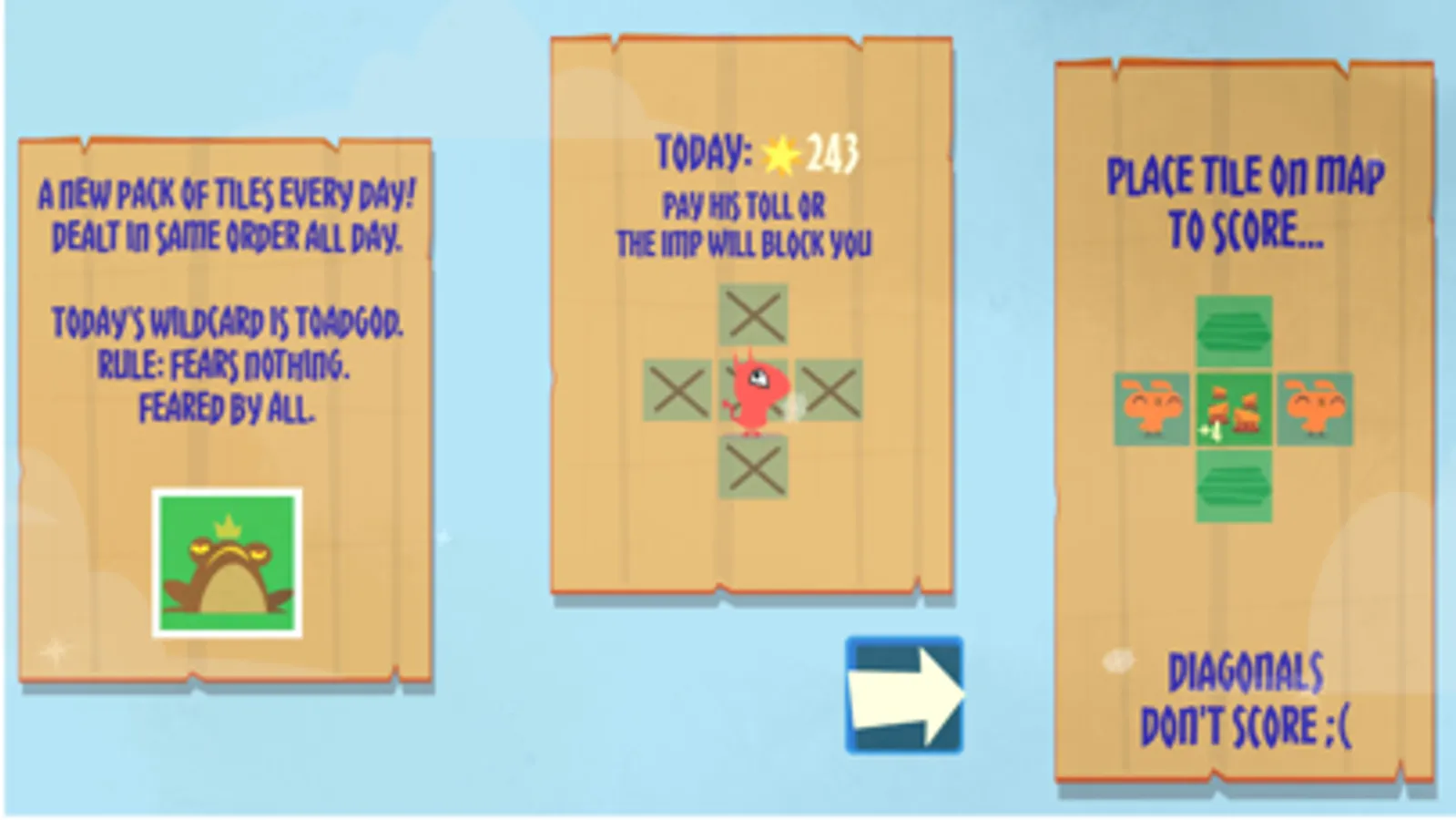 But every day the Imp resets the world - a new pack of tiles, dealt in a new order all day. A new starter map and new wildcard. Even the Imp’s path is the same all day so there’s no luck, it’s all down to your skill at placing each tile to score the maximum. Check your map score against everyone else on the daily leaderboard.