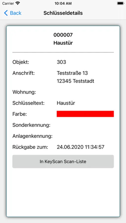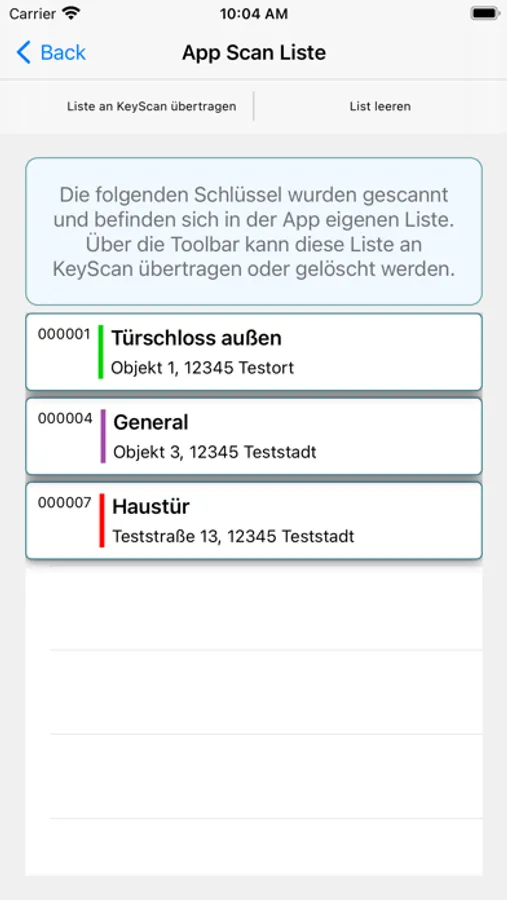 Hier werden die Barcodes gescannt und in einer internen App-Liste gespeichert. Dadurch können Details der Schlüssel betrachtet werden. Die App-Liste kann zu einem späteren Zeitpunkt auch an KeyScan übermittelt werden. Zusätzlich können dazu noch Benutzer ausgewählt / gescannt werden, sowie die Unterschrift erfasst werden.