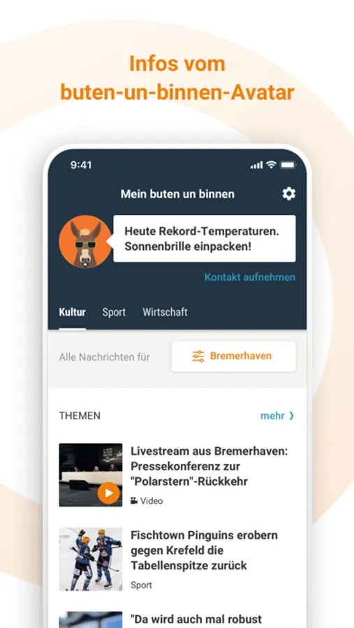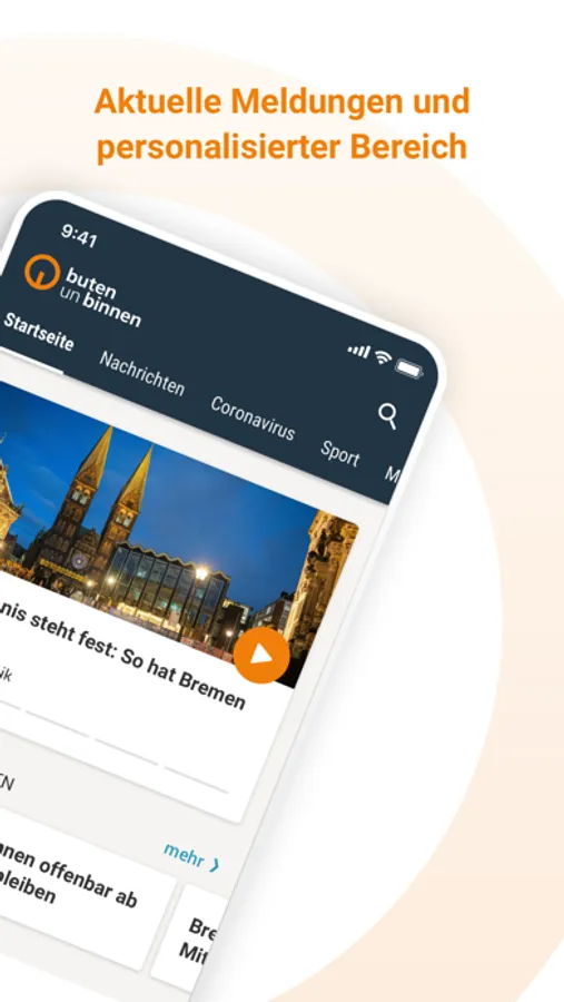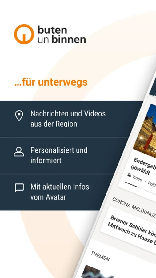 Ob Fußball-, Theater- oder Politik-Fan, mit der buten-un-binnen-App bleiben Sie schnell und überall über die Themen informiert, die Sie am meisten interessieren. Abonnieren Sie sich Ihre Lieblingsthemen für Ihren persönlichen Nachrichtenfeed und erhalten Sie Push-Nachrichten, wenn etwas Wichtiges in Bremen und Bremerhaven passiert.