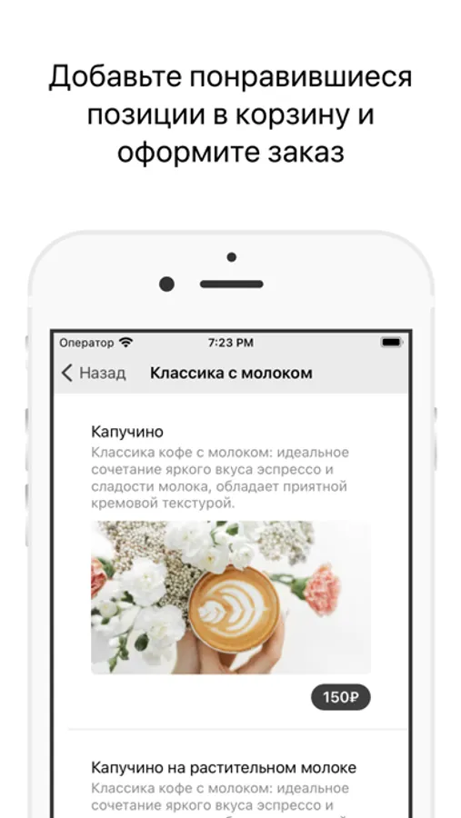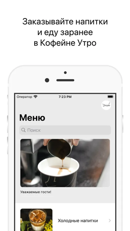 Как сделать заказ в приложении “Кофейня Утро”: выберите понравившиеся позиции из меню, добавьте их в корзину и перейдите на экран оформления заказа (по нажатию на иконку корзины).
