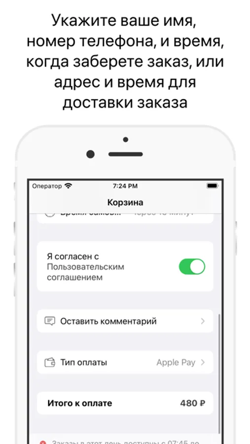 Укажите время, когда хотите прийти за своим заказом или выберите доставку с указанием времени и адреса доставки.