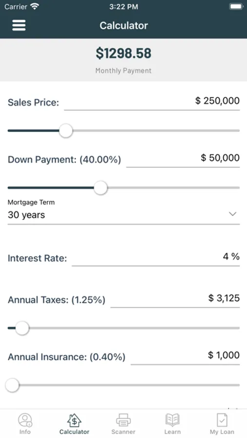 Calculate scenarios based on down payment amount, interest rate, and other variables