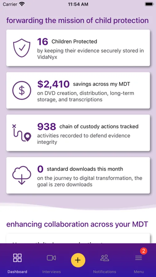 For existing VidaNyx users only. Comprehensive evidence management. For teams committed to better protecting and serving child survivors, VidaNyx Standard is a comprehensive digital evidence tool that enables collaboration across child advocacy teams, accelerates access to evidence, and saves time and money by eliminating the use of DVDs and other time-consuming and redundant processes. With user-based access permissions, you can be confident that their stories are safe and only viewable by those who need it.
