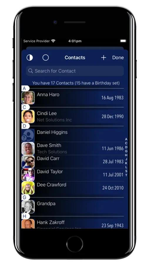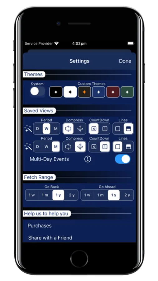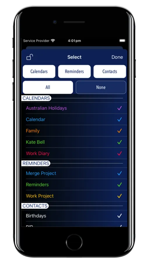 Fast-select which Calendar and Reminder lists to view, then view events side-by-side to gain a new perspective of your personal, work, holiday events, subscribed calendars, as well as Contact Birthdays and Anniversaries...