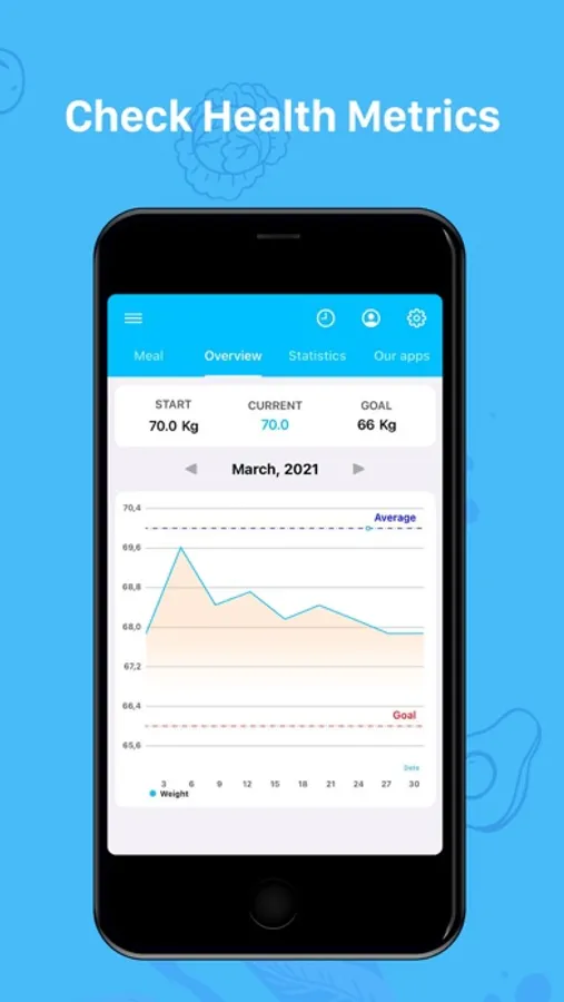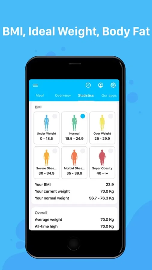 - Look on statistics about your weight, i.e. average weight, body mass index, difference to the starting weight and even more.