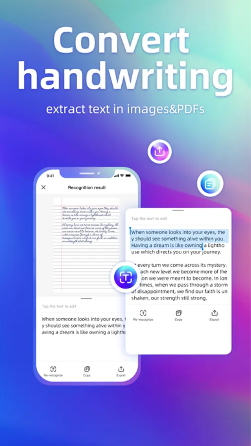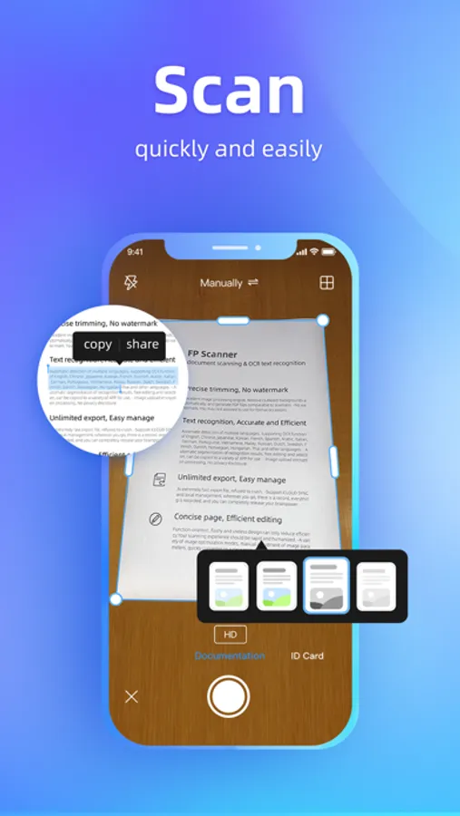 *Fast Text recognition&Extraction. Whether it is PPT courseware, company documents transcription, paper books, shopping receipts, photo translation text, ID card recognition and so on, FP Scanner can accurately and efficiently extract all of the text for you.
