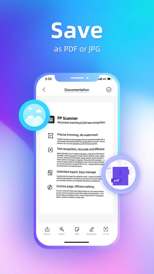 -Excellent image processing engine, Remove cluttered backgrounds automatically, and generate PDF files comparable to scanners.