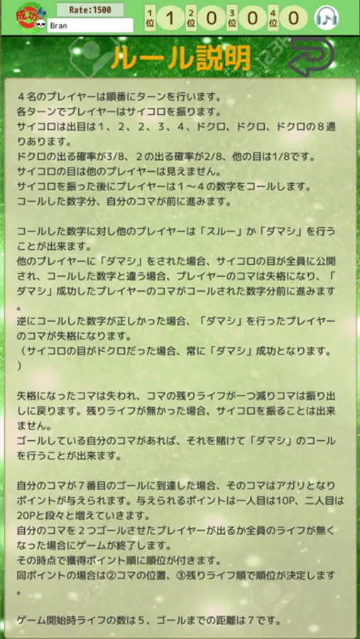 逆にコールした数字が正しかった場合、「ダマシ」を行ったプレイヤーのコマが失格になります。