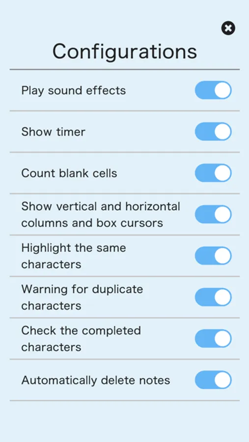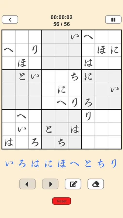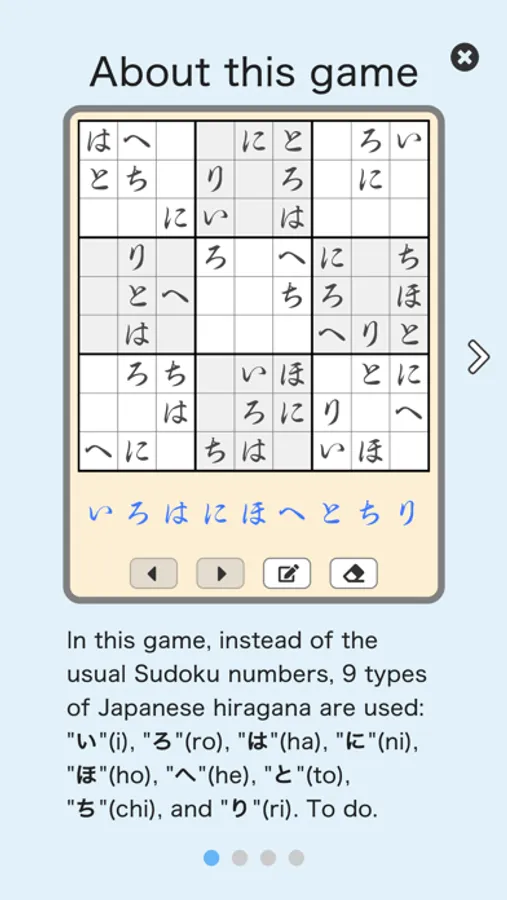 In this application, instead of the usual Sudoku numbers, the nine Japanese hiragana characters "い(i)", "ろ(ro)", "は(ha)", "に(ni)", "ほ(ho)", "へ(he)", "と(to)", "ち(chi)", and "り(ri)" are used to play.