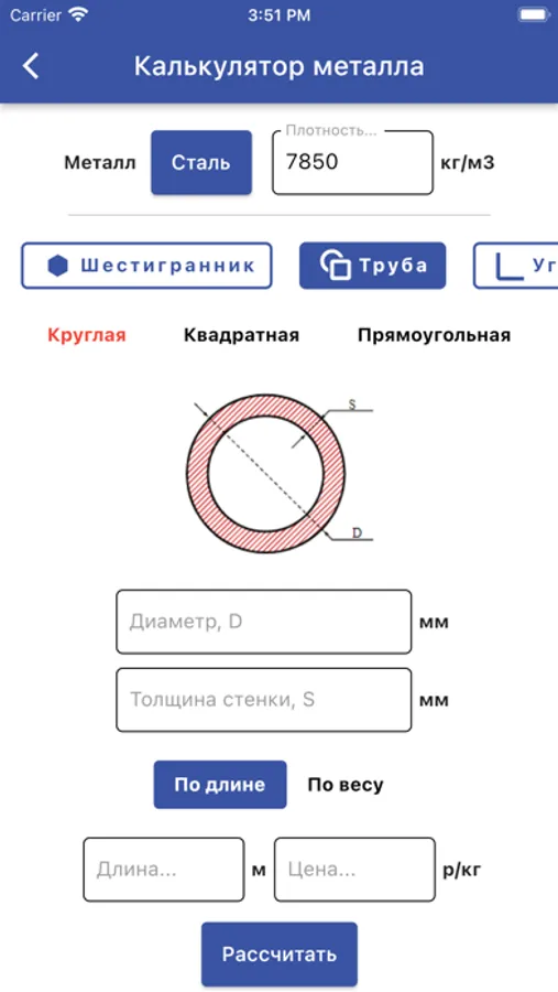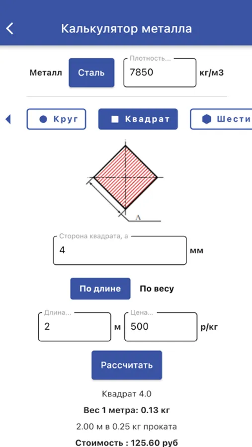 - Калькулятор металла ( вес, цена, длина ). Возможность добавления нового металла.