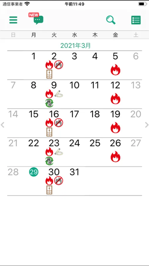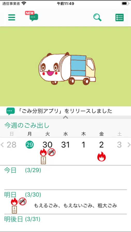 今日と明日、週ごと、月ごとの3パターンによるごみ収集日程を一つの画面ですぐに確認することができます。