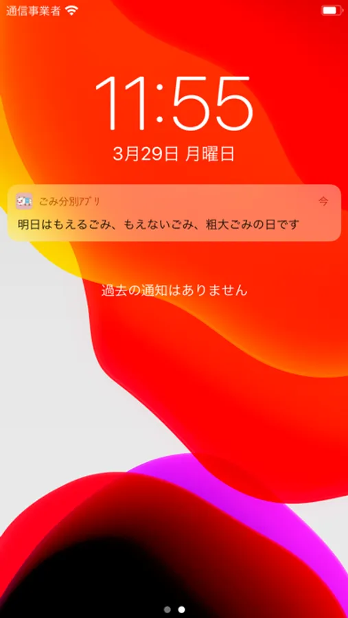 収集予定のごみ種別を前日と当日にアラートでお知らせします。時間は自由に設定することができます。