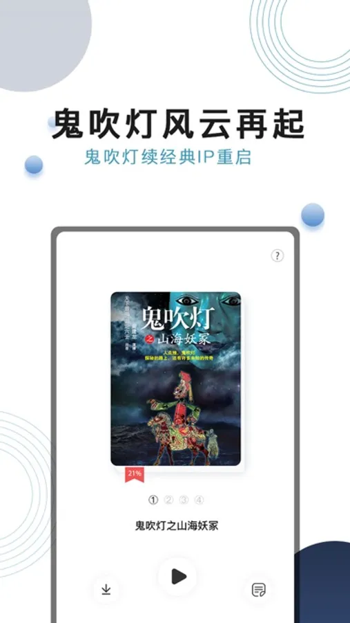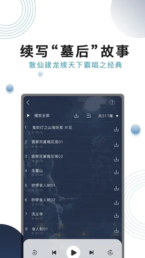 鬼吹灯续有声小说APP提供鬼吹灯全集系列四部合集有声小说在线收听,并支持书籍节目下载离线收听,有WiFi时把书籍下载到手机,在旅行途中、上下班路上随时随地想听就听。