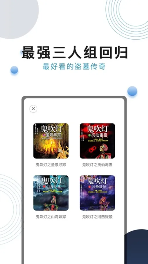 鬼吹灯续有声小说APP囊括天下霸唱续写鬼吹灯四部曲合集:湘西疑陵、山海妖冢、抚仙毒蛊、圣泉寻踪,由散仙建龙-周建龙先生倾情演绎,中广影音制作出品。