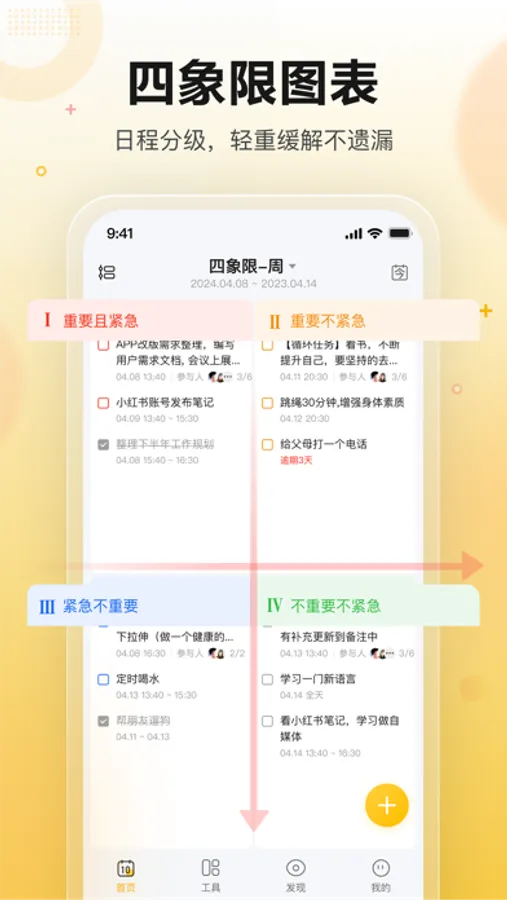 重要四象限: 依据轻重缓急,将待办事项划分为四个象限。把精力投入到真正重要的事情上,不再被琐事裹挟。