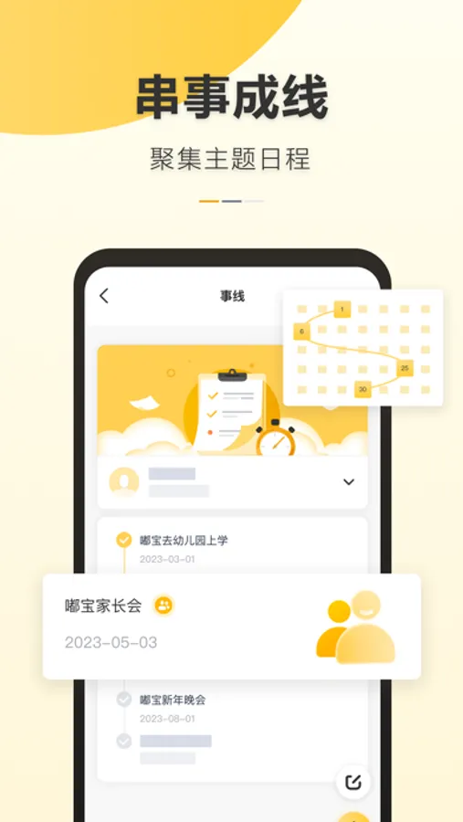 - 事件集创建:按照不同的线条对日程进行归档,让一个线条的下的多个日程安排一目了然。比如宝宝打疫苗、团建出行安排等