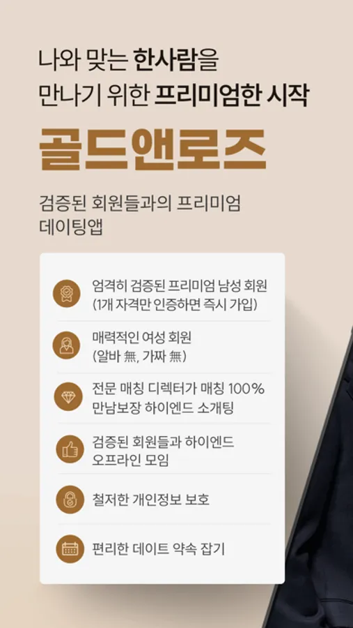 철저한 인증과 검증된 회원제로 관리되는 골드앤로즈에서 당신의 이상형을 만나보세요.