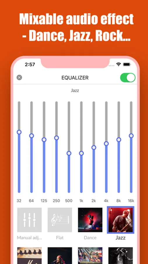 Includes Normal, Classical, Dance, Flat, Folk, Heavy Metal, Hip hop, Jazz, Pop, and Rock. It provides you powerful equalizer and different tones.