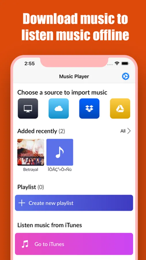 - You can download your music from Google Drive, Dropbox, iCloud or Transfer music from your PC easily to listen music offline