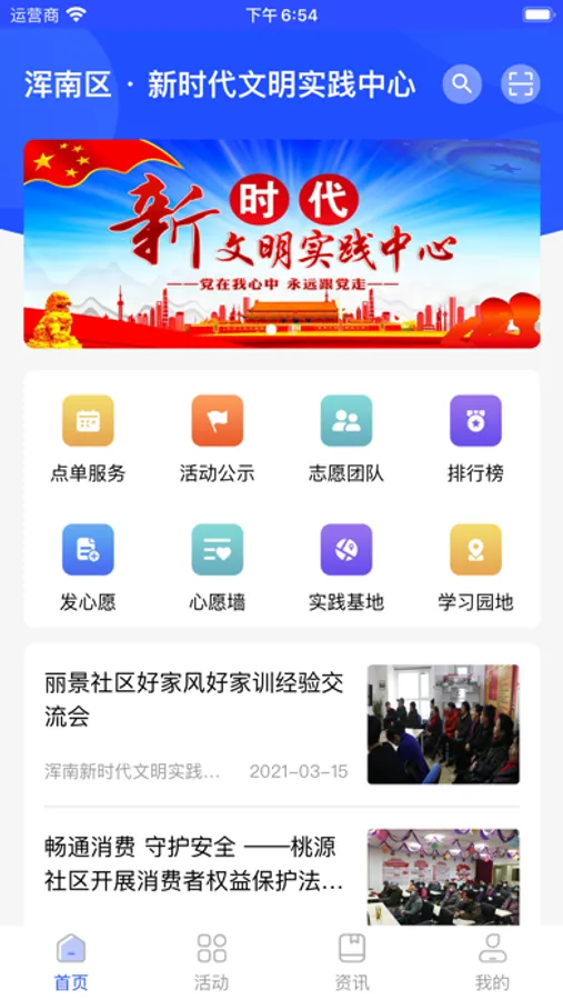 浑南区新时代文明实践APP是为广大群众、志愿者提供的志愿服务平台。用户可以进行活动打卡,发布需求,进行志愿活动招募,申请志愿队伍,发布志愿服务信息等。
