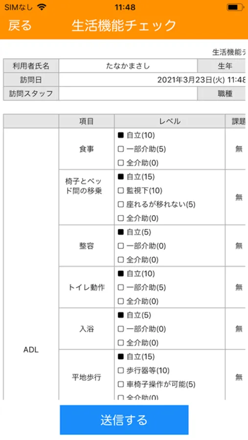 ○「生活機能チェックシートアプリ」を使うことで、日常生活動作(ADL)や手段的日常生活活動(IADL)に関する項目から、自立度や介助の度合いを把握することができます。"