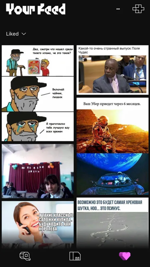 — Выбирайте лучшие мемы в личную коллекцию из бесконечной ленты, как в тиндере или через поиск.