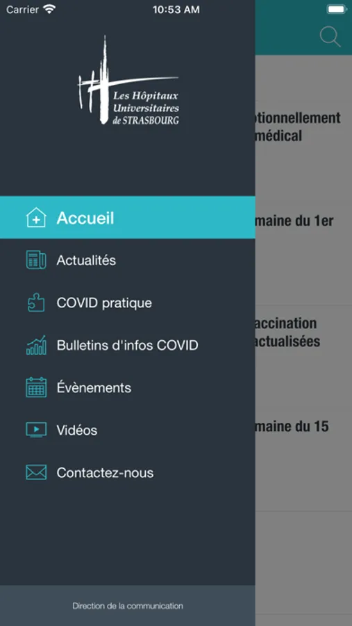 Cette application est à destination des professionnels de santé et de toute personne intéressée par les Hôpitaux Universitaires de Strasbourg. Elle comporte des actualités générales, des bulletins chiffrés COVID pour le grand public, un agenda d'évènements accessibles à tous et des articles d'information.