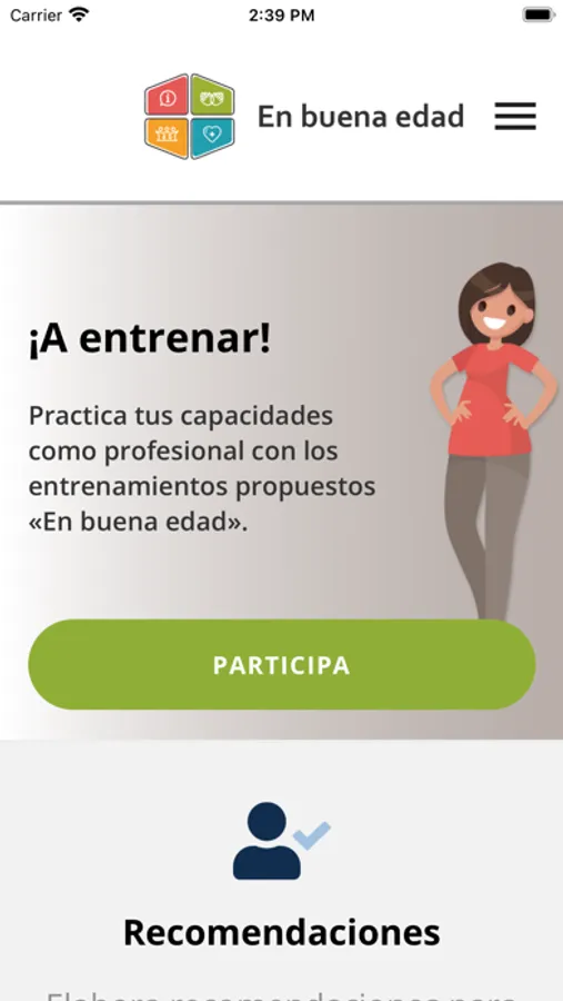 «En Buena Edad - Profesionales» es una aplicación móvil para el entrenamiento de profesionales sanitarios y la generación de recomendaciones de promoción del envejecimiento saludable para personas autónomas, frágiles y en situación de dependencia.