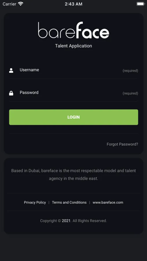 The Bareface Talent App is specifically for Talent that have already been accepted as Talent with the Bareface Talent Agency and been have been sent a username and password for use of this Application.