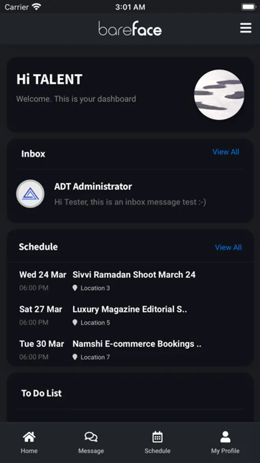 For these Talent, you can maintain you relationship with Bareface including keeping your portfolio and contact information up to date. The app will also inform you of any new Events you have been scheduled for and seek your confirmation. You can also block out dates you will not be available. The app also allows you to communicate with the Bareface Bookers on details of any bookings.
