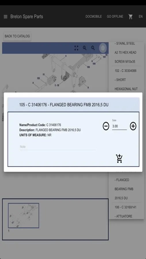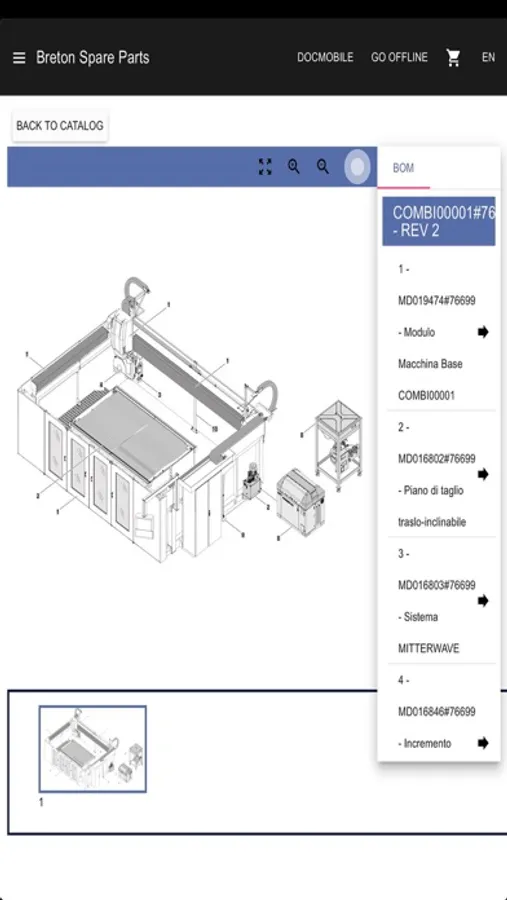 E-commerce where Breton's customers and workshops suppliers can: explore spare parts catalog; visualize the interactive svg of a machinery group or single part; make their own cart and send orders to Breton; manage and track orders.