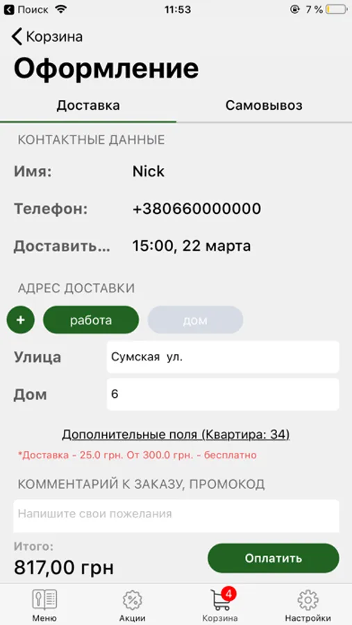 • встановити час доставки замовлення додому;