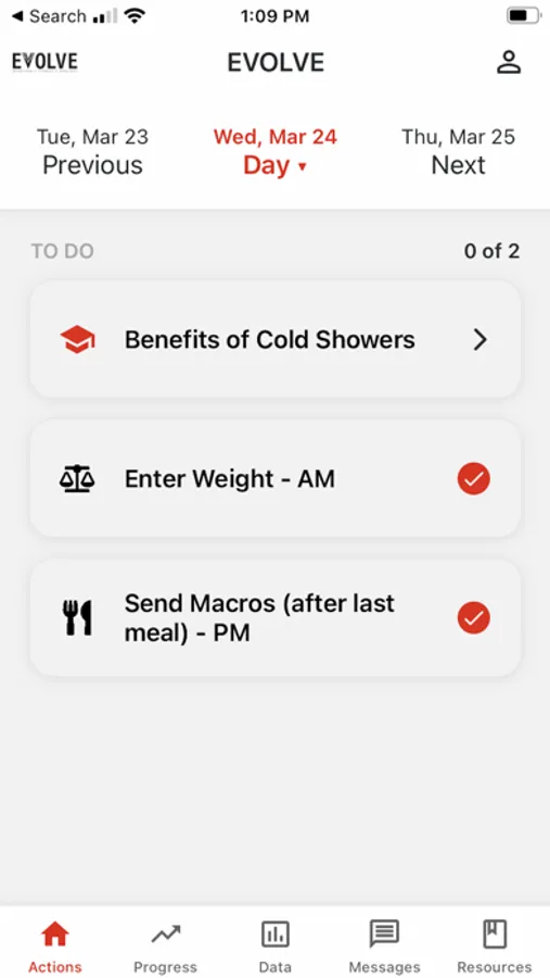 The EVOLVE COACH app is designed for clients of trainers who have enrolled in the EVOLVE COACH program. The app will send push notifications and prompt clients to answer yes/no question in regards to comply with healthy habits sent by your coach.