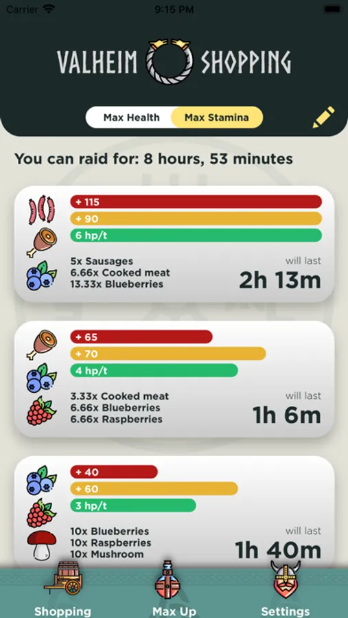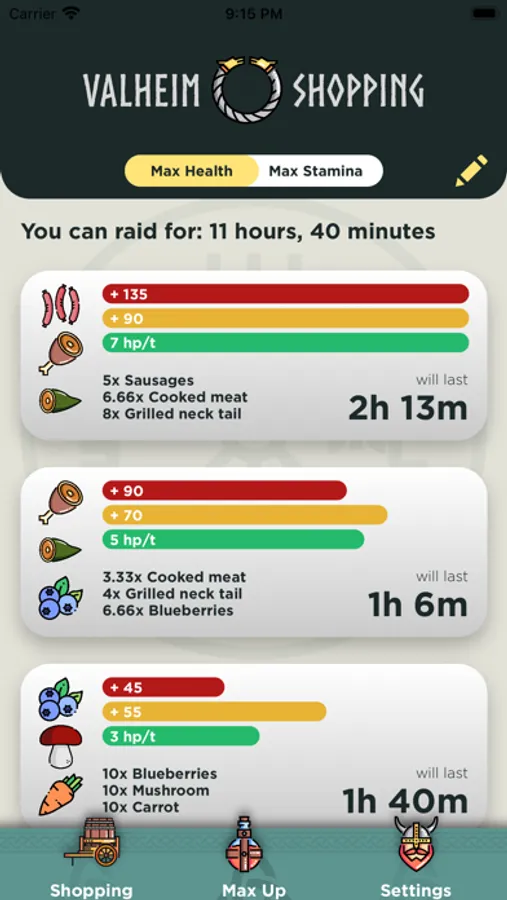 - MaxUp tab, that allow you to add all your current eatable foods. And will calculate to best combos in order for maximum health or stamina.
